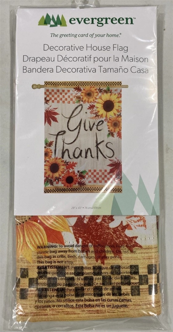 Give Thanks 2-Sided Decorative House Flag *NEW* Retail Price: $17.99 Price: $5.00 SKU808412929250 34 units available - + (min 6) Add to wishlist Email a friend Tweet Other products by Evergreen
